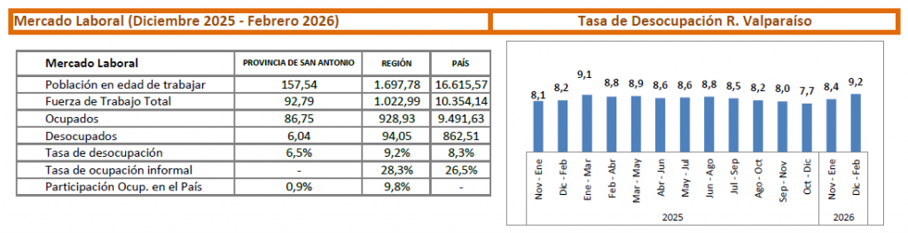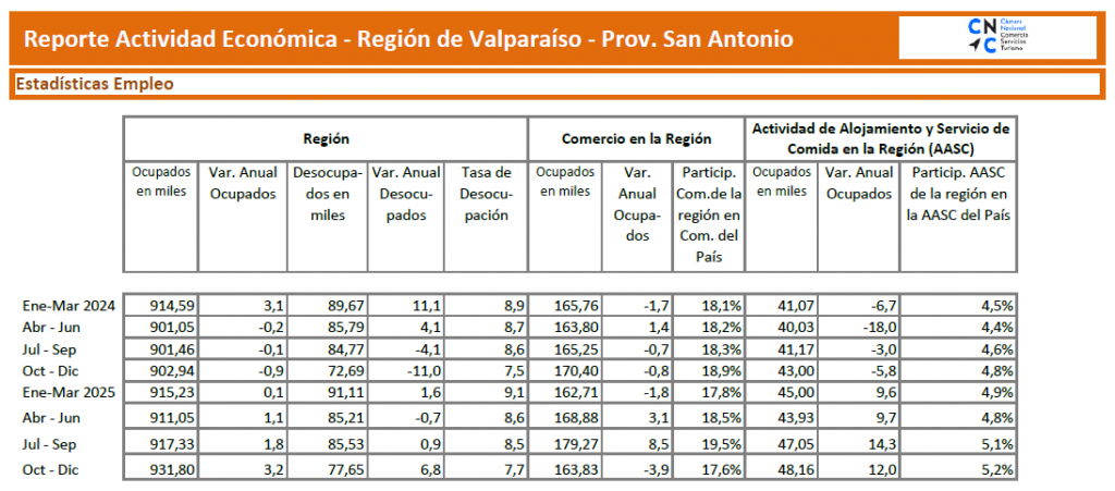 La Provincia de San Antonio continúa consolidando su dinamismo económico, de acuerdo con la Ficha Estadística Regional General de abril de 2026 elaborada por el Departamento de Estudios de la Cámara Nacional de Comercio (CNC). El informe revela que durante el trimestre octubre-diciembre de 2025 se registraron 931.800 personas ocupadas, lo que representa un aumento interanual de 3,27%. En este escenario, el comercio y el sector de hoteles y restaurantes destacan como los principales generadores de empleo, mientras la zona mantiene una tasa de desocupación cercana al 7,5% en el período diciembre 2025-febrero 2026.
